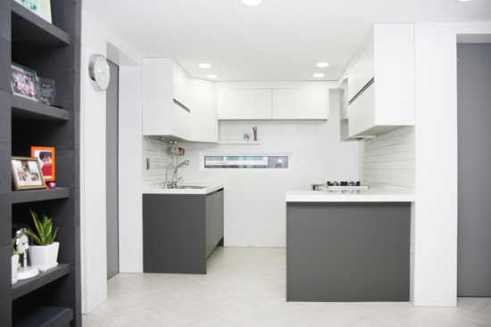 노후된 연립주택을 밝은 톤의 마감재로 계획하여 화사하고 넓게 느껴지도록 계획/시공했다. 목재 슬라이딩도어가 적절히 공간을 구획하는 역할을 한다.